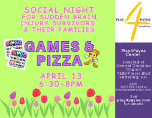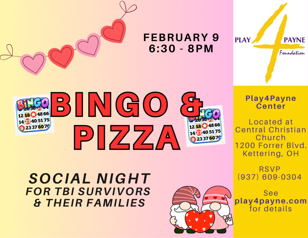 Monday, February 9, 2026 6:30 PM – 8:00 PM–Dinner and Bingo for brain injury survivors and their families. Come join us to connect and have fun in a safe and supportive environment! RSVP by calling Mark at (937) 609-0304 or email us at play4payne@gmail.com. See flyer below for details.