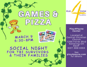 Monday, March 9, 2026 6:30 PM – 8:00 PM–Dinner and Bingo for brain injury survivors and their families. Come join us to connect and have fun in a safe and supportive environment! RSVP by calling Mark at (937) 609-0304 or email us at play4payne@gmail.com. See flyer below for details.