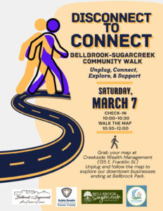 Saturday, March 7, 2026 Disconnect to Connect walk in Bellbrook. Arrive between 10 and 10:30 AM. See the flyer below.